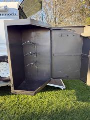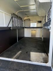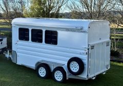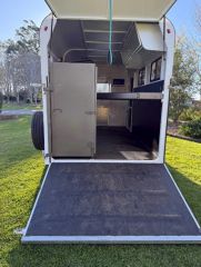 Has a Breakaway safety system, a caravan security split door, mud guards and external toolbox. Swing out tac box with room for three saddles plus hangers for bridals etc.